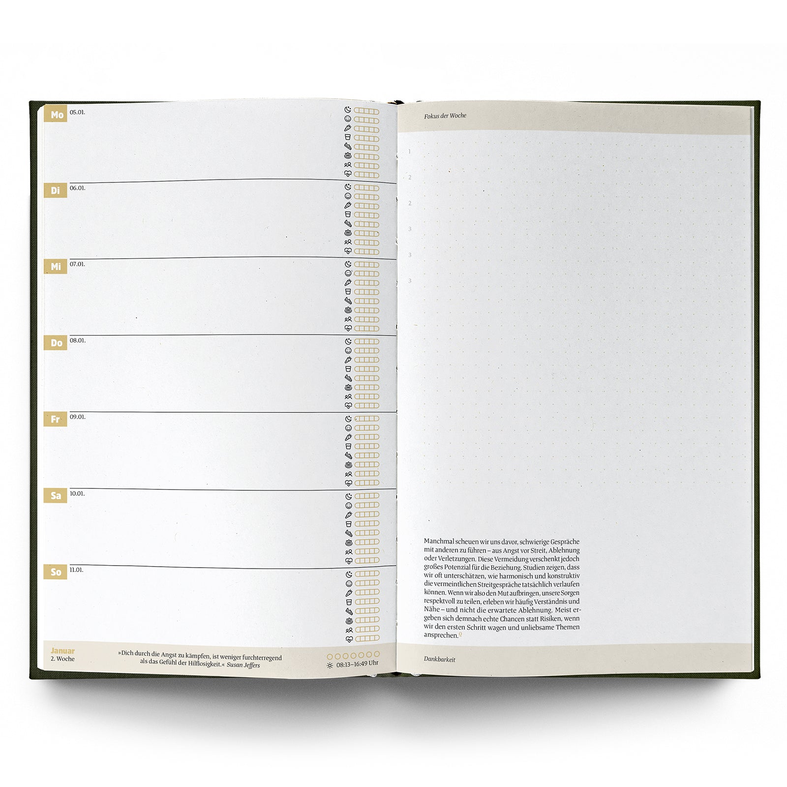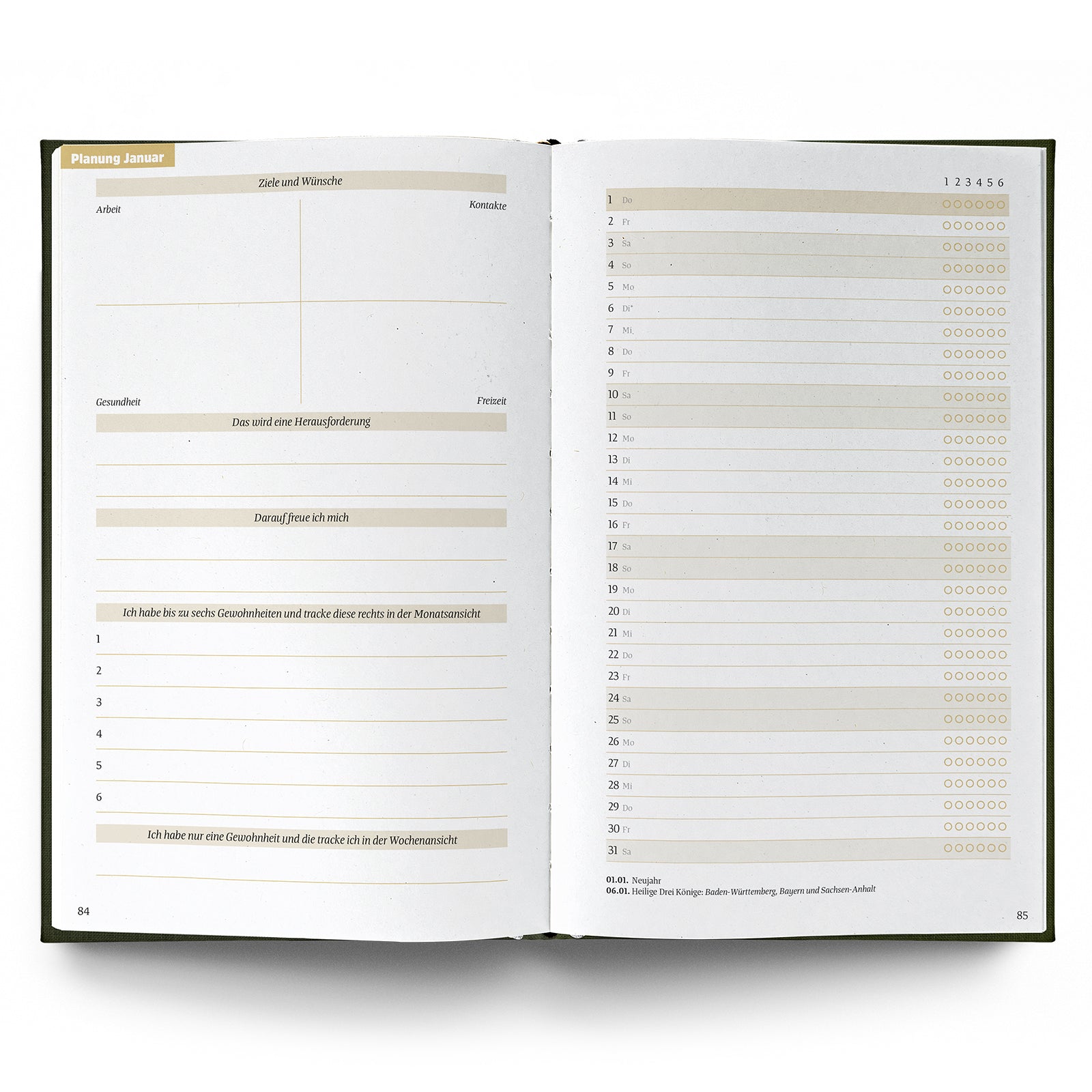 Inhalt Wochen- und Monatsübersichten mit FokusfeldernHersteller Ein guter VerlagFarbe WaldMaße 14,4 × 22,5 × 2 cmMaterial Vegane Materialien, hochwertiges RecyclingpapierZertifikat Blauer Engel & V-Label-lizenziert
